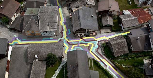 Jalanan di Vercorin Switzerland dilukis seperti garis-garis geometri. Setiap tahunnya, kota ini memanggil pelukis untuk membuat karya selama musim panas.