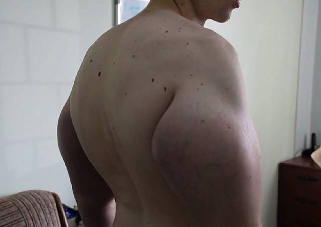 Kulit lengan atasnya juga berubah warna ungu yang mengganggu, meski katanya itu adalah efek samping sementara.