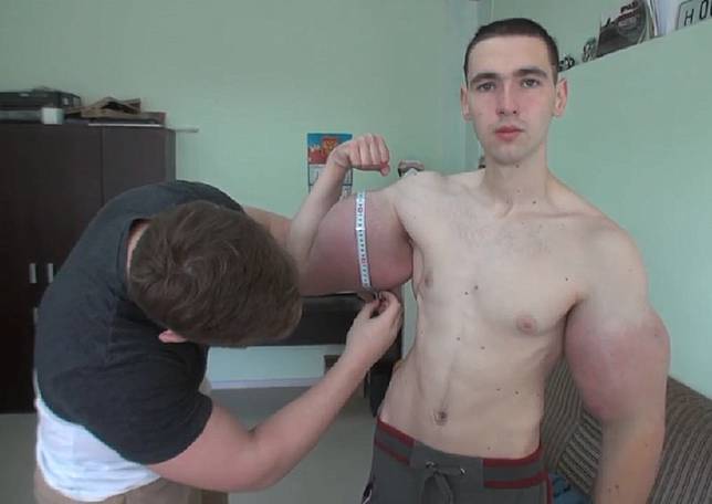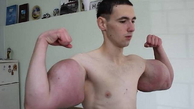 Namun seorang pemuda di Rusia mendapatkan lengannya yang mirip Hulk hanya dalam waktu satu bulan. Kirill Tereshin memiliki bisep dan trisep berukuran lingkar 60 cm.Ini jelas tidak proporsional untuk tubuh rampingnya.Pria berusia 21 tahun itu telah menyuntikkan synthol.
